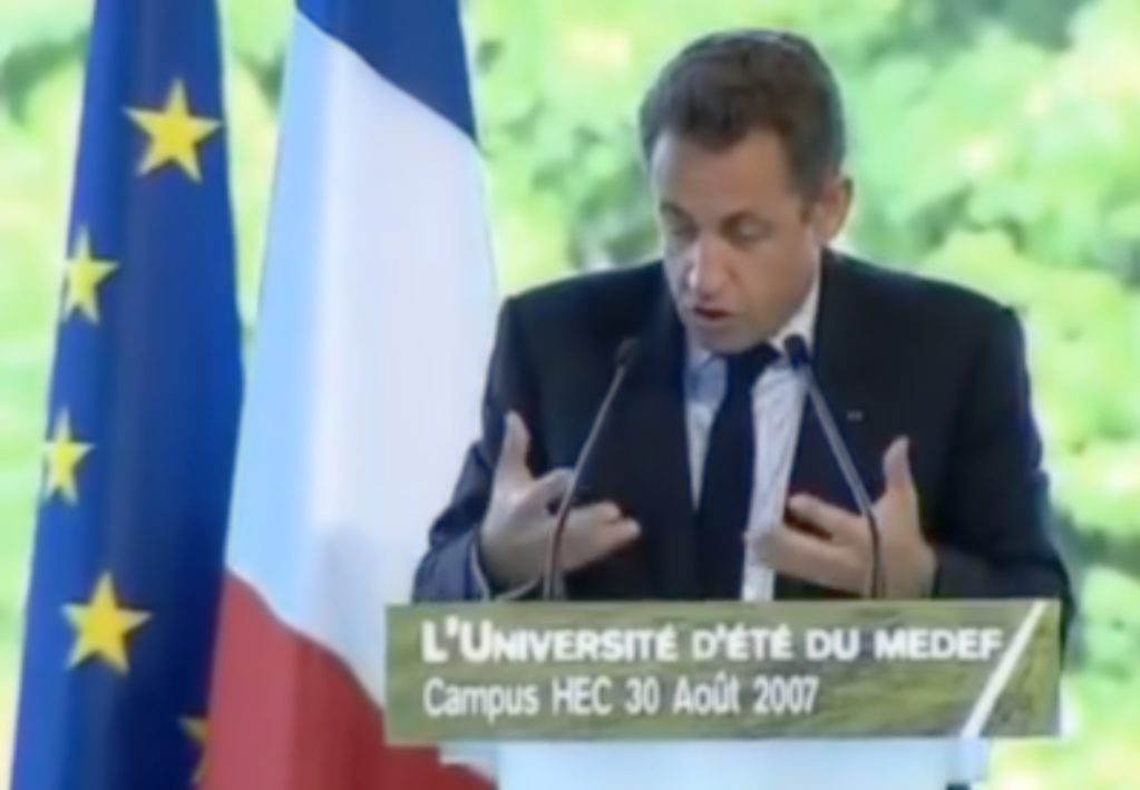 La grosse bagnole, la belle montre, le costard de marque, et puis l’invitation sur le yacht d’un copain milliardaire : la drague matérialiste est un genre en soi, et s’agissant des rencontres d’été du Medef, Nicolas Sarkozy est son champion. Songez-donc : dès 2006, le ministre de l’Intérieur d’alors fait une apparition remarquée en débarquant à l’évènement en hélicoptère depuis Troyes où il avait une réunion la veille, suscitant une comparaison avec Johnny Halliday formulée par son hôte, Laurence Parisot (je n’invente rien, l’ancien monde fonctionnait comme ça). Inutile de préciser qu’avec ce genre de personnage, une part de cabotinage et une absence totale de gêne sont à prévoir, comme l’année suivante, lorsque le Président de la République fraîchement élu est le premier occupant du poste (et à ce jour, sauf erreur, le dernier) à se rendre en personne à l’invitation du mouvement patronal. Il y fait d’ailleurs savoir « à tous ceux qui ne m’invitent pas qu’il est difficile pour moi de venir si l’on ne m’invite pas » – oubliant sans doute un peu vite sa tendance à s’inviter partout –. Le problème avec le bling-bling, c’est le risque que les paillettes dans les yeux se muent en déception puis en rancœur tenace, ce que l’intéressé aura l’occasion de vérifier en 2016 (après être arrivé en retard, comme il se doit). En 2019, enfin, le temps était à la nostalgie, et devinez quoi : à la surprise d’absolument personne, il a fait des blagues sur ses divorces.